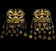 Ces deux pendentifs étaient sans doute fixés de chaque côté du visage de la jeune femme. On y voit le maître des animaux tenir deux dragons par les pattes. Il est vêtu à la mode nomade, d’une longue jupe et d’un caftan croisé et serré à la taille Une partie des éléments d’un des deux pendentifs a disparu!